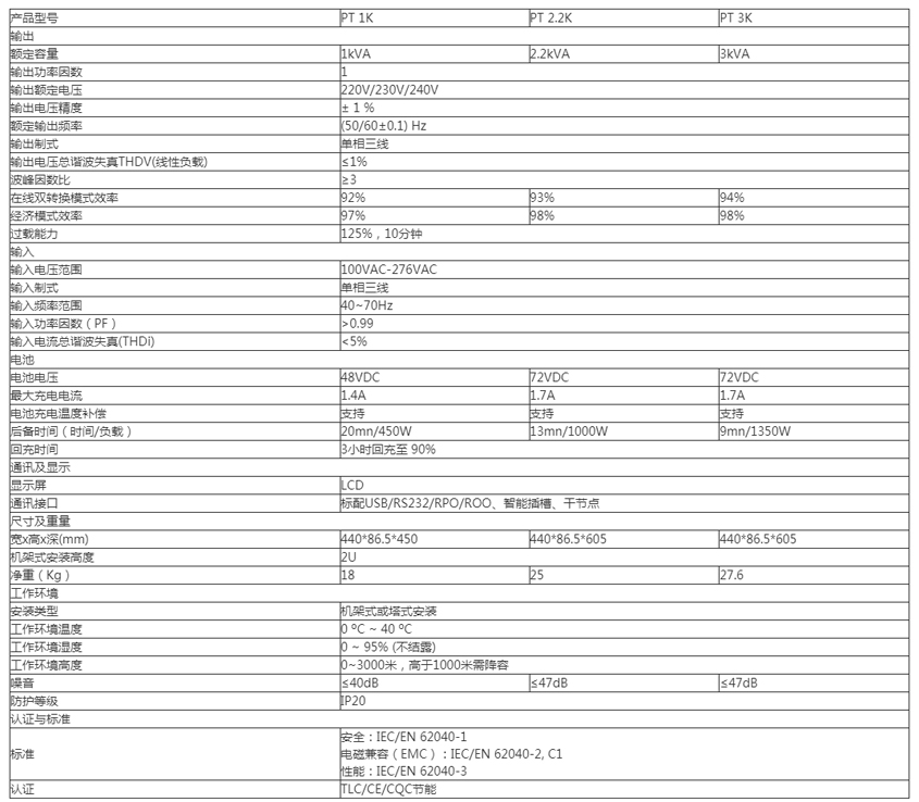 输出功率因数=1,满足更多负载类型;更低能耗,满足新一代机房趋势,3K/10K/20K效率分别达94%/95%/96%;CE/TLC 认证,满足一类指标;